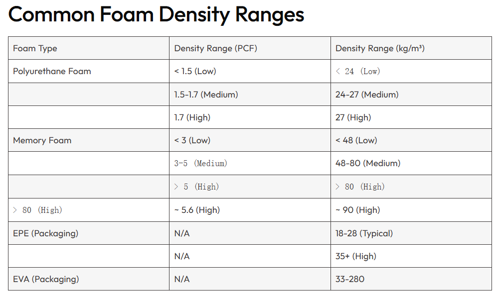 A densidade da espuma refere-se à massa por unidade de volume da espuma — essencialmente, o quão compacto ou pesado o material é. Espumas mais densas pesam mais para o mesmo volume e normalmente têm células menores e mais compactadas.