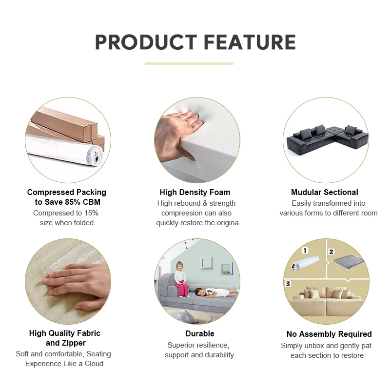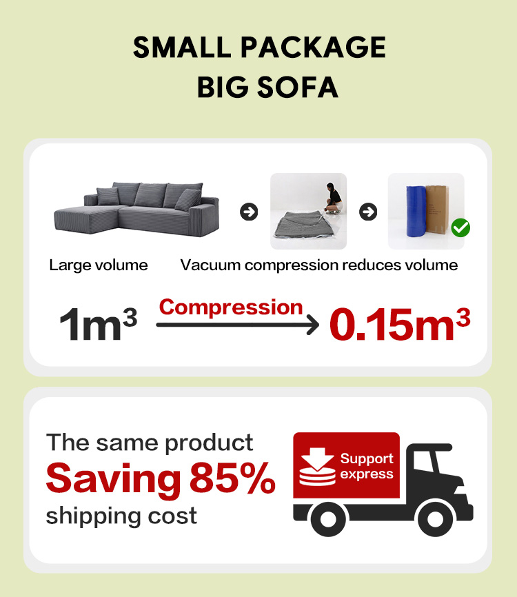 Este design inovador é ideal para e-commerce e remessas internacionais, ajudando a reduzir os desafios logísticos e os custos de transporte. Além disso, sua natureza compressível facilita o armazenamento ou a reposicionamento do sofá pelos proprietários quando espaço extra é necessário temporariamente.